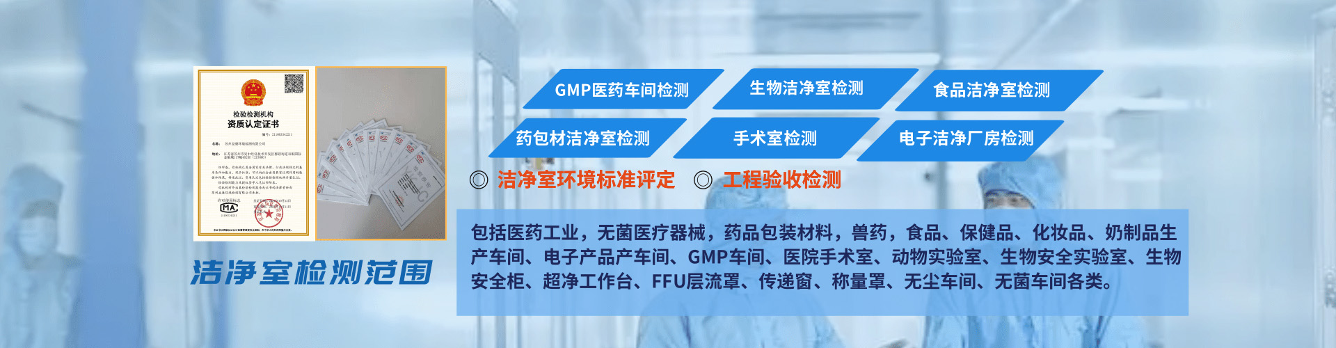 主營業(yè)務(wù):凈化車間檢測 三方潔凈室檢測 計算機化系統(tǒng)驗證 潔凈室檢測 gsp溫濕度驗證 高效過濾器檢測 壓縮空氣檢測  純化水檢測 潔凈度檢測